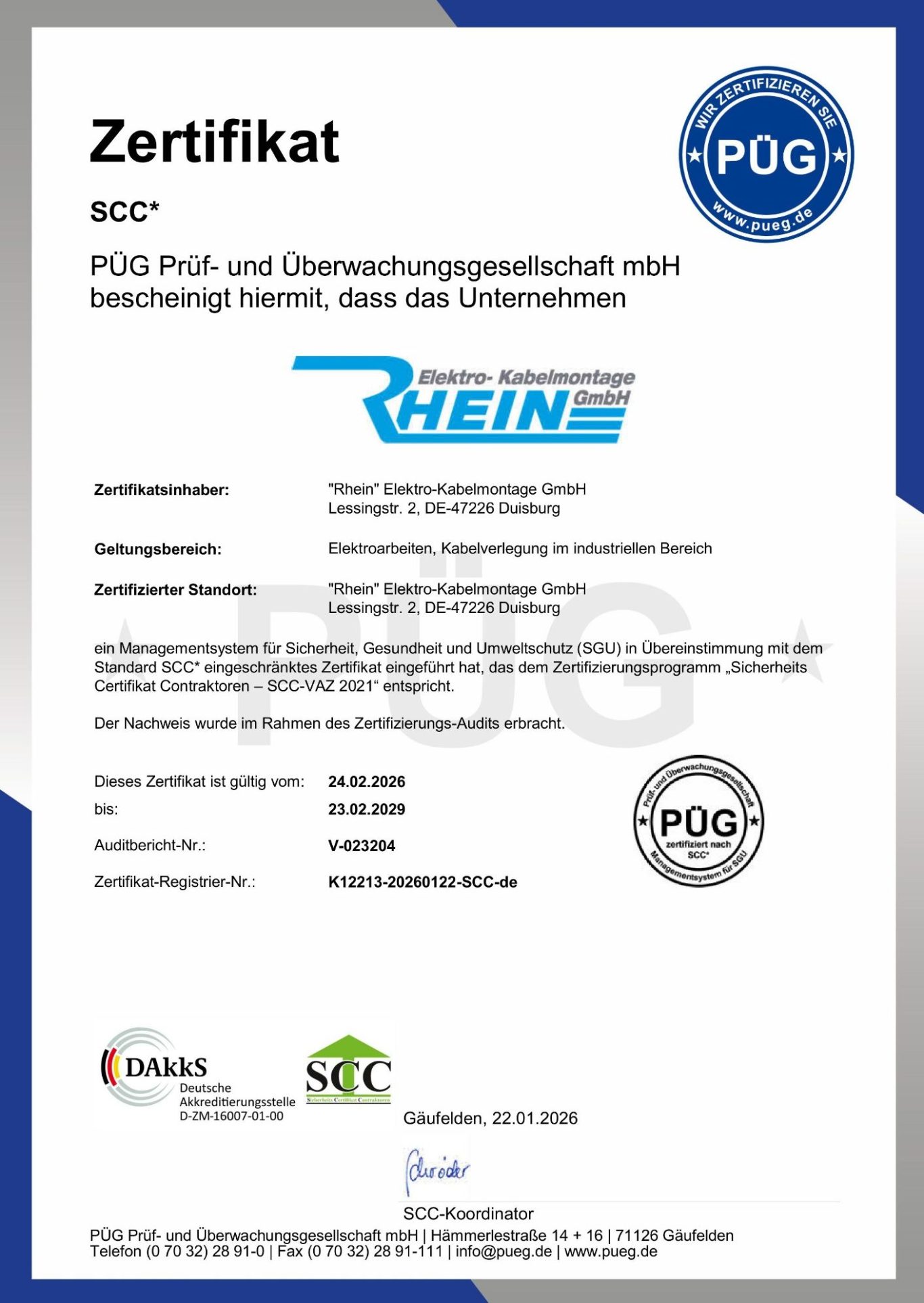 Im Jahr 2010 haben wir das Zertifikat SCC für alle Mitarbeiter und das gesamte Unternehmen erlangt, was uns ermöglicht, die höchsten Sicherheitsstandards zu erfüllen. Dieses Zertifikat ist nicht nur ein Zeichen unseres Engagements für Sicherheit, sondern auch ein wichtiger Bestandteil unserer Unternehmenskultur. Durch eine transparente und verantwortungsvolle Unternehmensführung sowie das vorbildliche Verhalten unserer Mitarbeiter stellen wir sicher, dass die Sicherheits-, Gesundheits- und Umweltschutz-(SGU)-Standards bei der Ausführung unserer Montagen stets eingehalten werden.